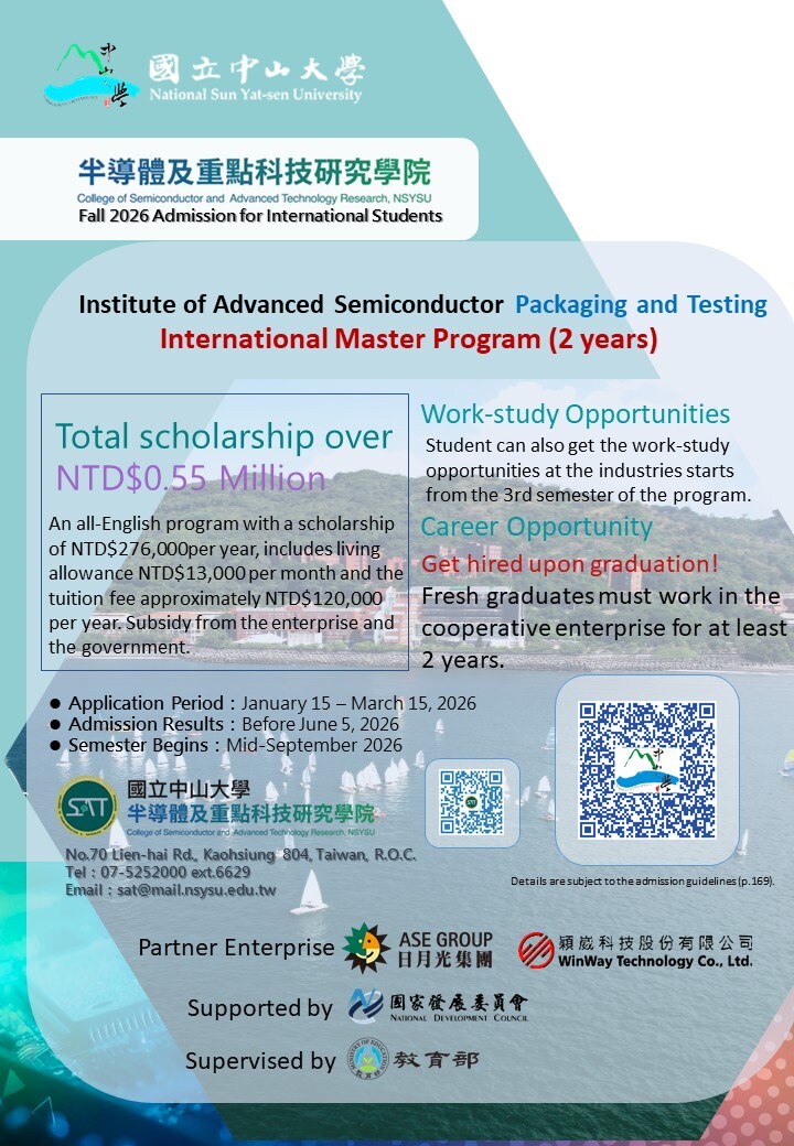 115學年度《先進半導體封測研究所》外國學生招生(申請期間:2026 年 1 月 15 日至 3 月 15 日)